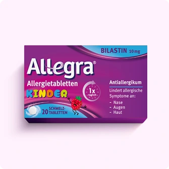 Übrigens: Jugendliche ab einem Alter von 12 Jahren können Allegra® Allergietabletten mit 20 mg Bilastin, die ebenfalls als Schmelztablette oder als Tablette erhältlich sind, einnehmen.