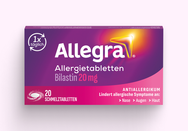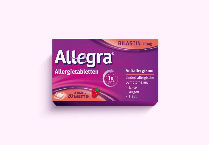 Allegra® Schmelztabletten lindern schnell allergisch bedingte Symptome an Nase, Augen und Haut – in der Regel innerhalb von 30-60 Minuten. Das Antiallergikum ist praktisch für unterwegs, denn die Schmelztabletten mit Erdbeergeschmack zergehen auf der Zunge und können auch ohne Wasser eingenommen werden. Sie lindern die Allergiesymptome wirksam für 24 Stunden– mit nur einer Tablette am Tag.