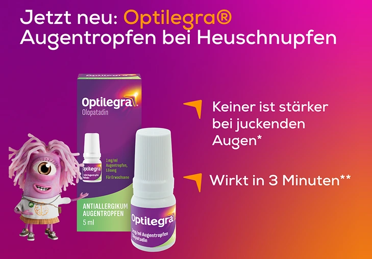 Die Augen sind eine der Haupteintrittspforten für Allergene wie Pollen. Deshalb treten häufig Symptome wie Juckreiz, Rötung und Tränenfluss bei Heuschnupfen auf. Die neuen Optilegra® Augentropfen wirken gezielt dort, wo die Symptome auftreten – an deinen Augen. So lindert Optilegra® Heuschnupfenbeschwerden an den Augen in nur 3 Minuten2. Keiner ist stärker bei juckenden Augen.1