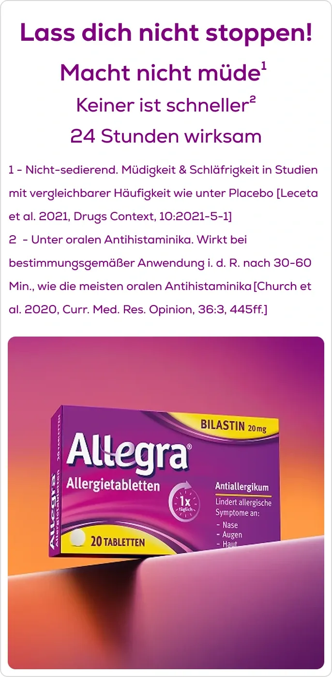 - Vgl. aktuelle Gebrauchsinformation von Allegra Allergietabletten 20 mg Tabletten (Wirkstoff: Bilastin).