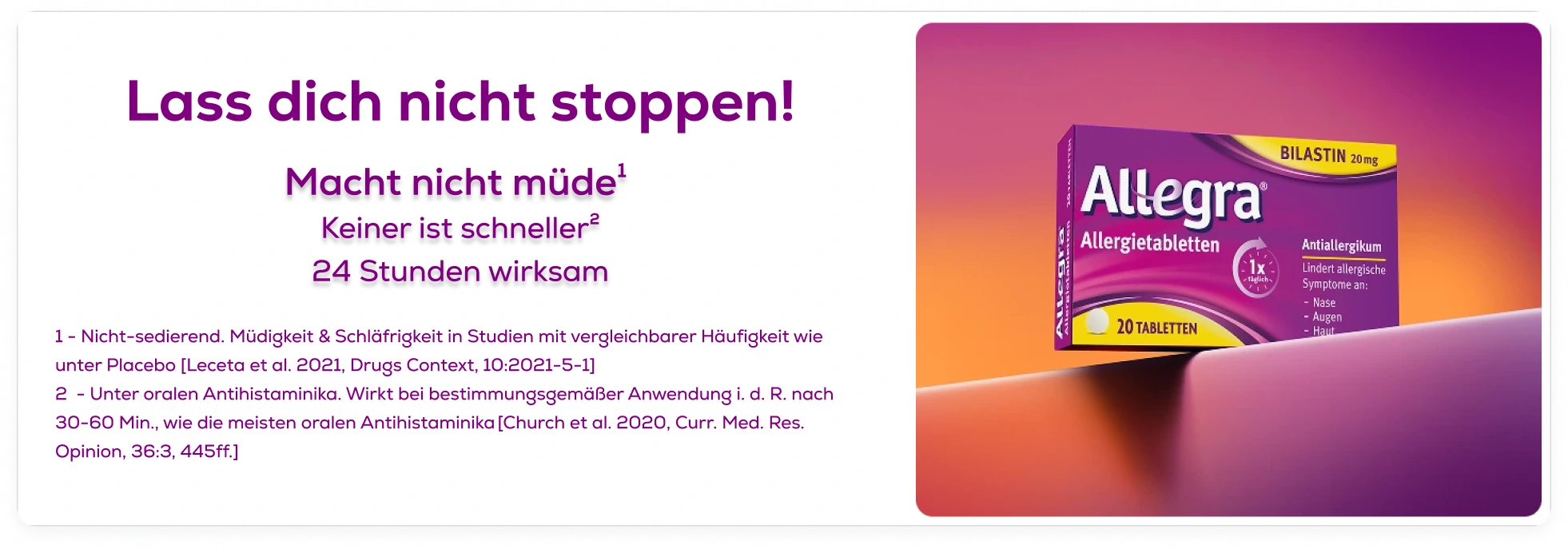 Ob im Beruf, beim Sport oder bei Treffen mit Freunden – Allegra® sorgt dafür, dass Du schnell weitermachen kannst, wie geplant. Allegra® mit Bilastin wirkt schnell, meist innerhalb von 30–60 Minuten. Denn der Wirkstoff Bilastin wird rasch aufgenommen und bekämpft gezielt Allergiesymptome.