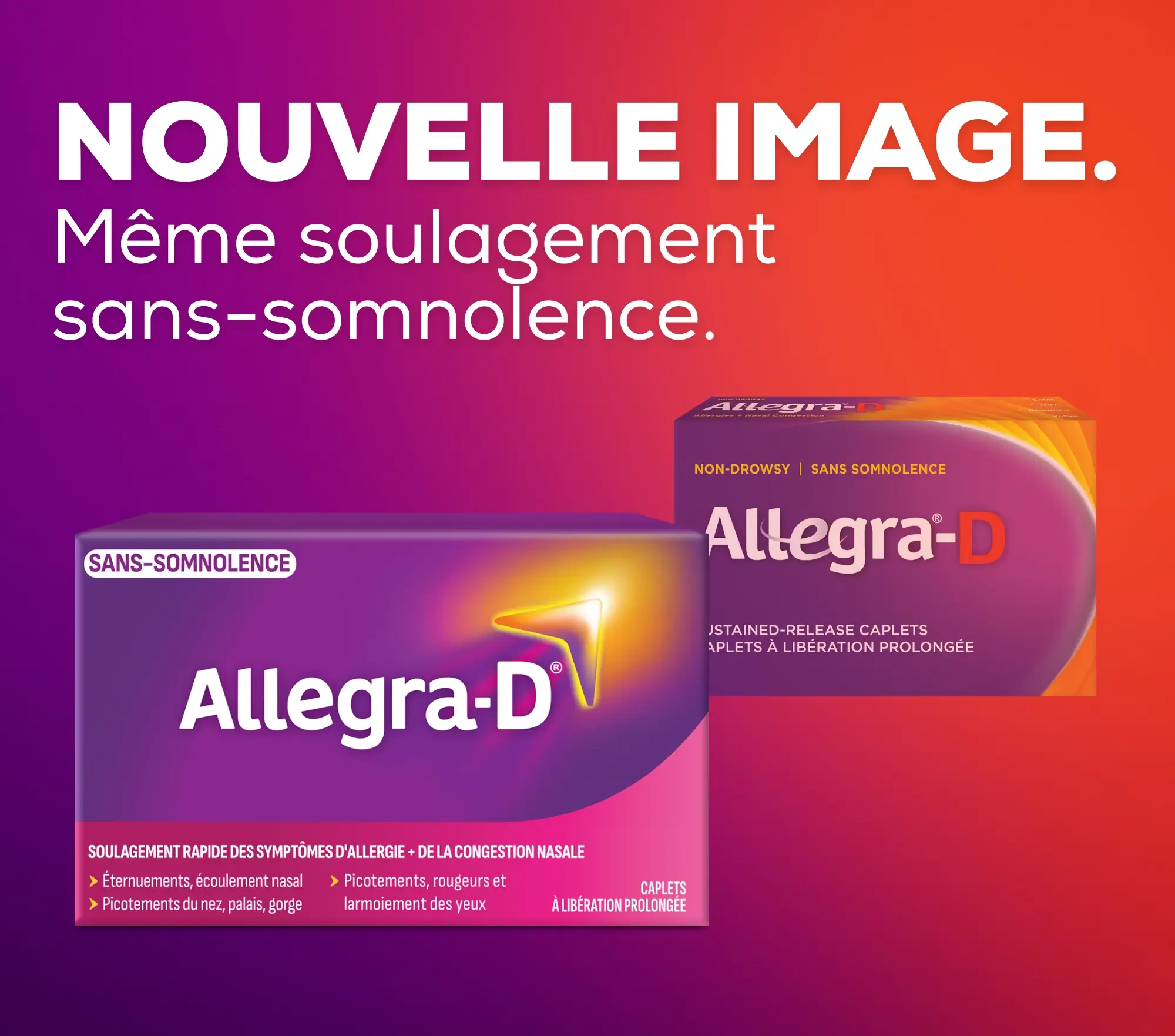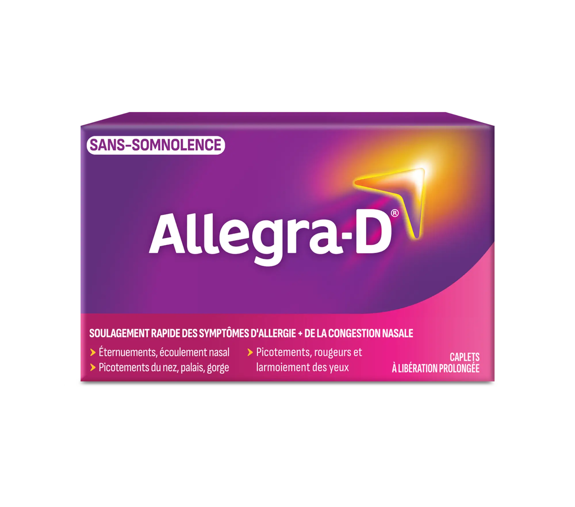 Soulagez votre congestion nasale, vos éternuements, vos larmoiements et vos picotements des yeux, du nez et de la gorge, tout cela grâce à Allegra®-D. Un seul comprimé permet de soulager jusqu'à huit symptômes d'allergies. Allegra®-D contient un décongestionnant qui a pour effet de réduire l’enflure des voies nasales et qui s’attaque à la congestion nasale tenace causée par les allergies.