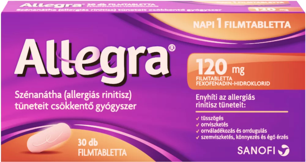Az Allegra® 120 mg filmtabletta az antihisztaminok csoportjába tartozó, recept nélkül kapható allergia elleni gyógyszer. A második generációs antihisztaminok csoportjába tartozó Allegra® 120 mg filmtabletta előnyös tulajdonságainak köszönhetően egész évben jelentősen javítja az allergiás betegek életminőségét.