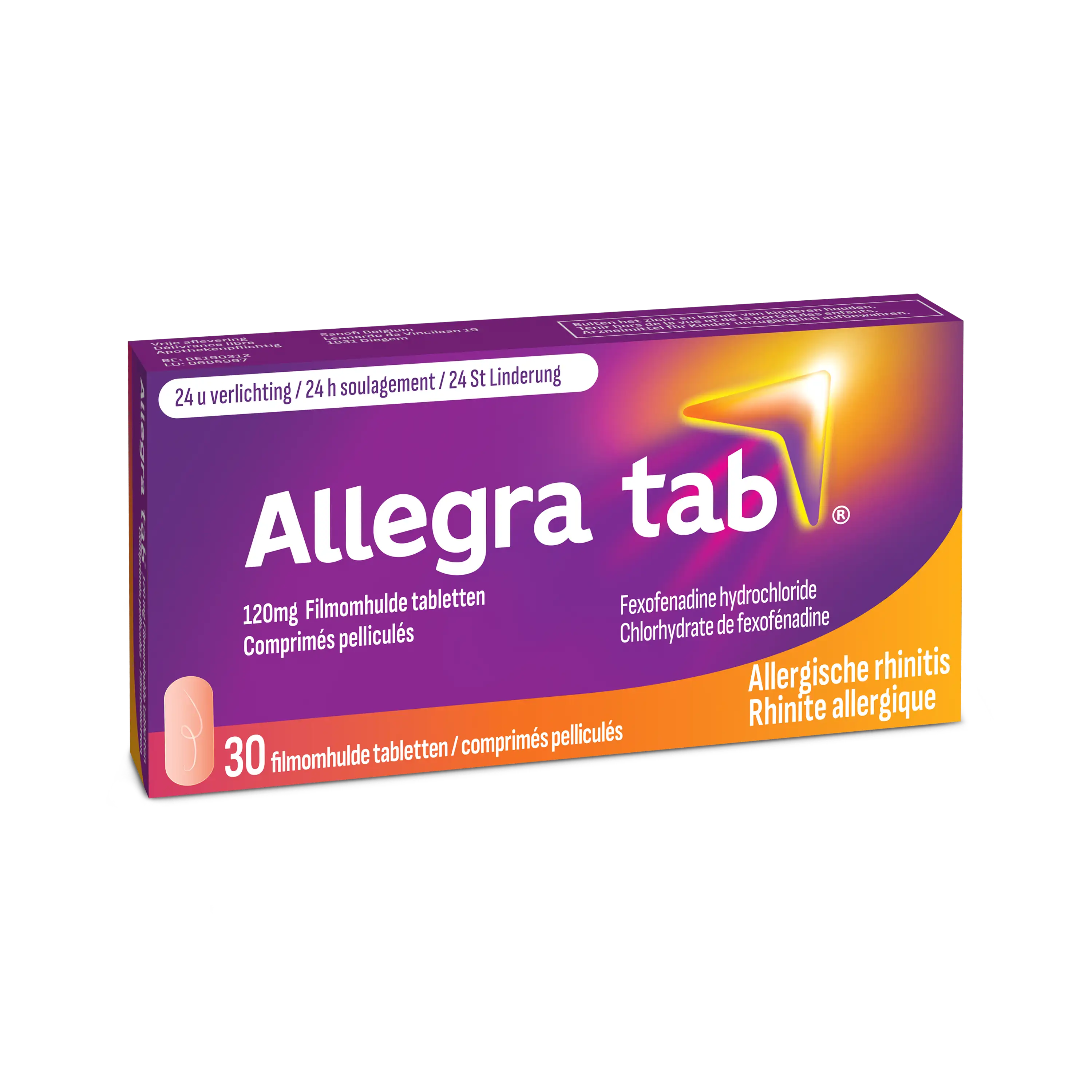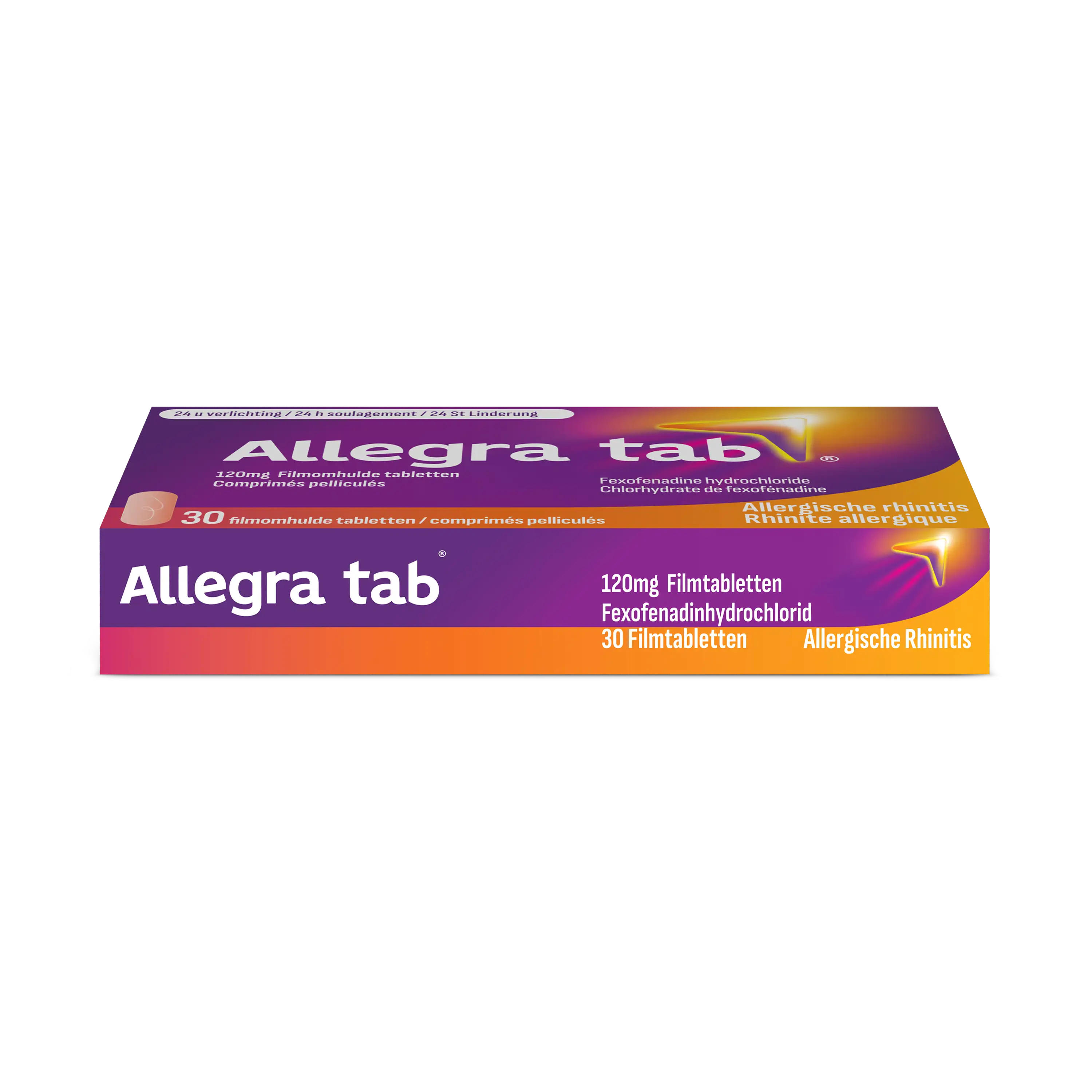 Allegra tab® verlicht hooikoorts en de daarmee gepaard gaande symptomen, zoals niezen, jeukende neus, loopneus of verstopte neus en jeukende, rode en waterige ogen. Allegra tab® treedt binnen één uur in werking, houdt de symptomen van hooikoorts onder controle gedurende 24 uur en hzal waarschijnlijk geen invloed hebben  concentratie*.