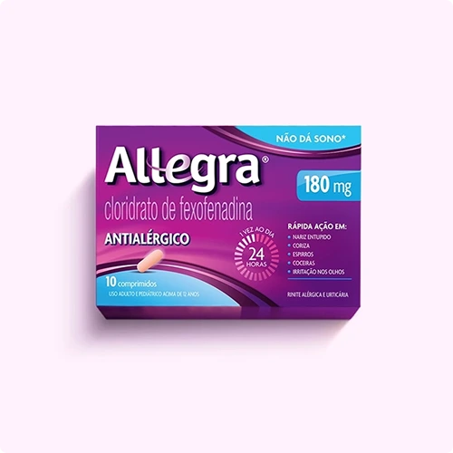 ALLEGRA® (cloridrato de fexofenadina). Indicações: é um anti-histamínico destinado ao tratamento das manifestações alérgicas, tais como sintomas de rinite alérgica (incluindo espirros, obstrução nasal, prurido, coriza, conjuntivite alérgica) e urticária (erupção avermelhada e pruriginosa na pele). MS: 1.8620.0010. O USO DO MEDICAMENTO PODE TRAZER ALGUNS RISCOS. Leia atentamente a bula. SE PERSISTIREM OS SINTOMAS, O MÉDICO DEVERÁ SER CONSULTADO. abril/2023. MAT-BR-2300881