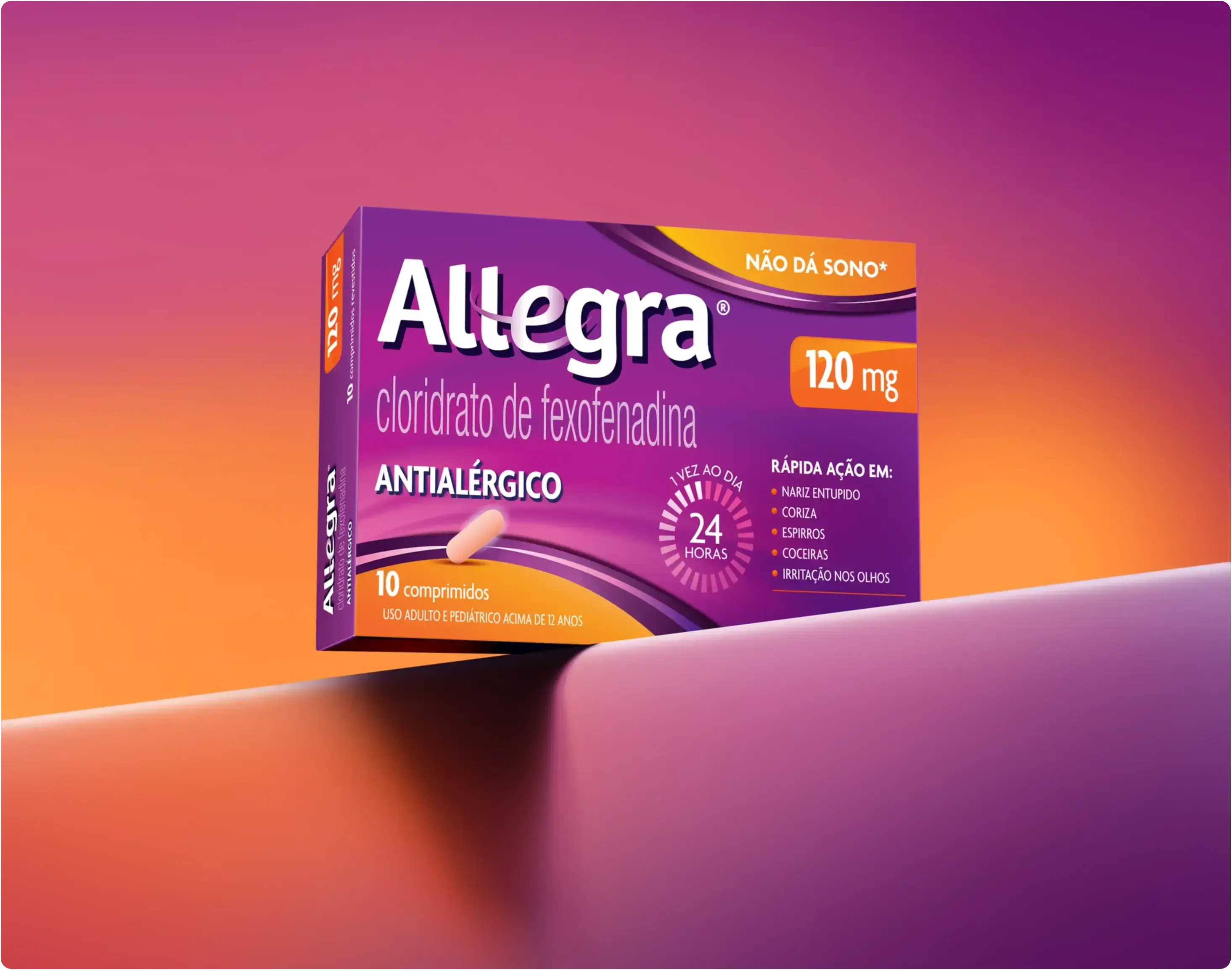 ALLEGRA® (cloridrato de fexofenadina). Indicações: é um anti-histamínico destinado ao tratamento das manifestações alérgicas, tais como sintomas de rinite alérgica (incluindo espirros, obstrução nasal, prurido, coriza, conjuntivite alérgica) e urticária (erupção avermelhada e pruriginosa na pele). MS: 1.8620.0010. O USO DO MEDICAMENTO PODE TRAZER ALGUNS RISCOS. Leia atentamente a bula. SE PERSISTIREM OS SINTOMAS, O MÉDICO DEVERÁ SER CONSULTADO. Mar/2025. MAT-BR-2501100