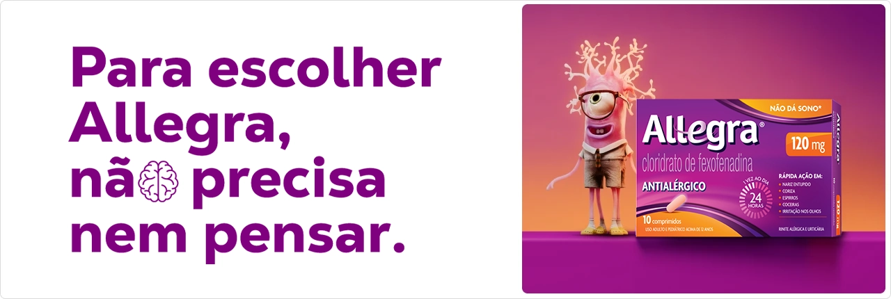 ALLEGRA® (cloridrato de fexofenadina). Indicações: é um anti-histamínico destinado ao tratamento das manifestações alérgicas, tais como sintomas de rinite alérgica (incluindo espirros, obstrução nasal, prurido, coriza, conjuntivite alérgica) e urticária (erupção avermelhada e pruriginosa na pele). MS: 1.8620.0010. O USO DO MEDICAMENTO PODE TRAZER ALGUNS RISCOS. Leia atentamente a bula. SE PERSISTIREM OS SINTOMAS, O MÉDICO DEVERÁ SER CONSULTADO. Mar/2025. MAT-BR-2501100