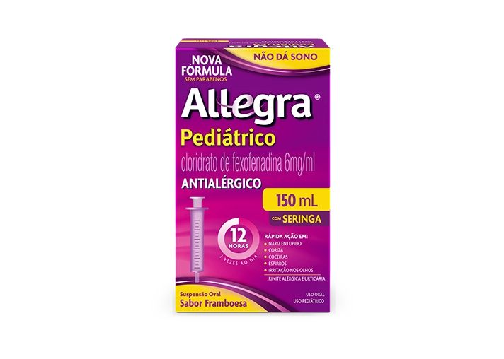 Allegra® Pediátrico foi desenvolvido para o tratamento da rinite alérgica em crianças a partir dos 2 anos de idade e para o tratamento de urticária a partir dos 6 meses. Allegra® Pediátrico não dá sono1 e não prejudica o desempenho escolar4.
